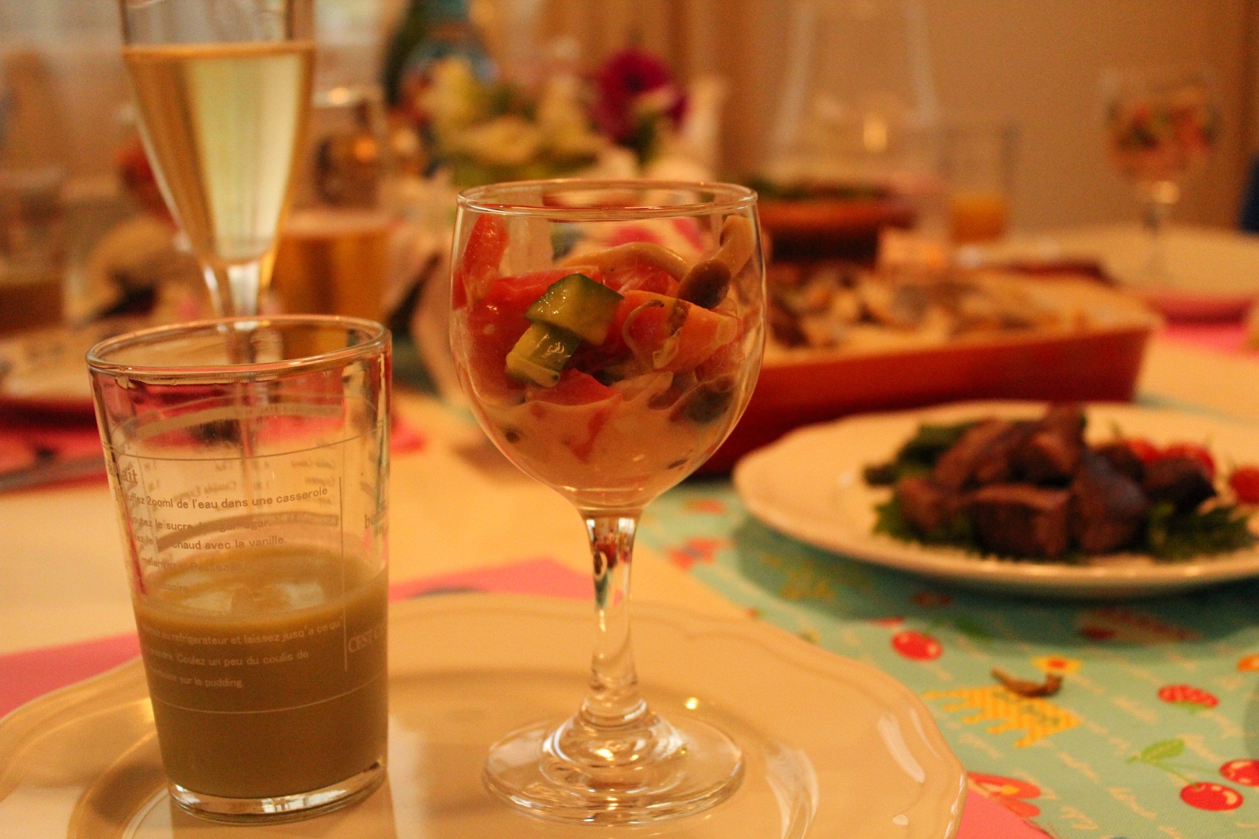 サラダはトマトやしめじやきゅうりをコールスロードレッシングにつけたり、